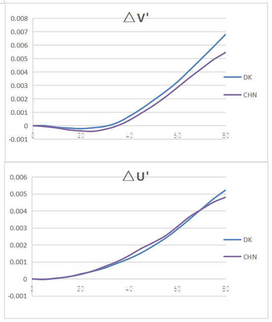 由于不同角度的光度數(shù)據(jù)量較大,直接看數(shù)據(jù)也不夠直觀,因此作如下圖,取0-80°的CIE1976色坐標(biāo)(u’和v’)的變化作圖(與0°的對(duì)比),其中藍(lán)色曲線DK為丹麥Viso數(shù)據(jù),紫色CHN為國(guó)內(nèi)客戶在華南某計(jì)量院測(cè)試數(shù)據(jù)。由下圖可以看出,Viso與傳統(tǒng)分布光度計(jì)測(cè)試的趨勢(shì)完全吻合。另外,COB從中心位置到邊緣的,越到邊緣的變化應(yīng)該是越大的,因此色坐標(biāo)的變化曲線也是應(yīng)該是越陡(斜率越大),從圖中可以看出Viso的數(shù)據(jù)更加的符合這種客觀變化。