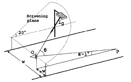 在計算眩光時,觀察者位于距右側路緣1/4 路寬處,并假定車輛頂棚的擋光角度為20°,這意味著計算時處于圖1 擋屏斜面以外的路燈將不予考慮。此外還規定觀察者始終注視著他前方90m 處的路面,這代表著視線與地面成1°角。