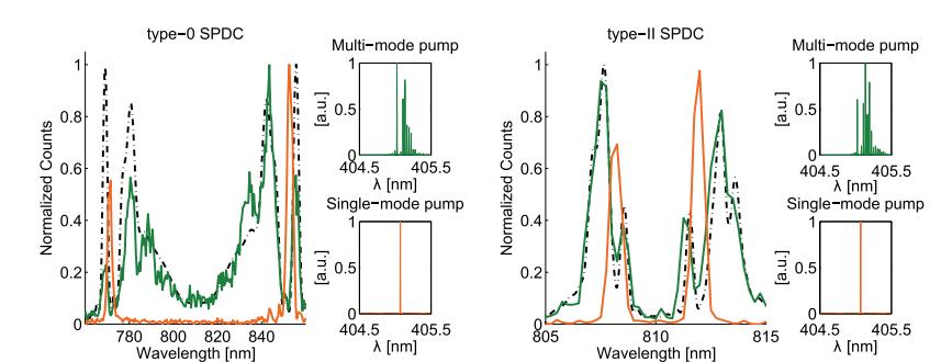 如圖所示,橙色曲線為利用405nm單模(窄線寬)激光泵浦的光子對輻射光譜曲線,綠色為利用405nm多模(寬線寬)激光泵浦后的光子對輻射光譜曲線,很明顯,0型PPKTP采用多模激光激發后光子輻射譜過寬,為了勉強可用還需要額外附加帶通濾光片做濾波;而II型PPKTP在采用多模激光激發后線寬漂移和展寬都不大,一般可以直接應用,也就是說II型更能適合多模激光泵浦源。