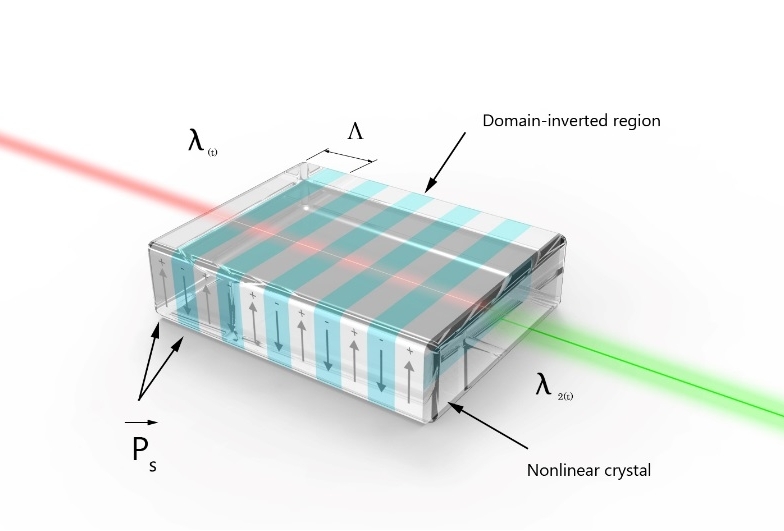 PPKTP其中的PP意思是周期性極化,具體來說是通過施加高壓電場使帶電磁性的晶體特定區域內的極性產生永久性的翻轉,當通過一定的工藝實現了穩定性的周期翻轉后,就在晶體內引入了非線性極化率的周期性的階躍變化,從而可以實現準相位匹配(QPM : Quasi Phase Matching)。根據準相位匹配理論,通過對晶體的非線性極化率的周期性調制來補償非線性頻率變換過程中因色散引起的基波和諧波之間的波矢失配,可以獲得非線性光學效應的有效增強。