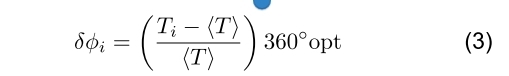 為了評估上述每種效應對斬波器抖動的影響,我們收集了 N 個周期的光信號,并將測量的周期繪制為時間的函數,以及所有測量值的直方圖。 我們不是以周期為單位繪制(秒),我們是以光學相位(°opt)為單位進行繪制。每個測量周期 Ti 均轉換為相位誤差 δψi,如下所示