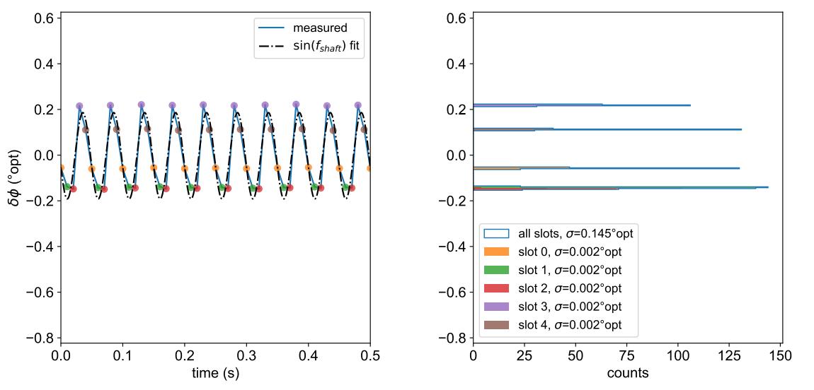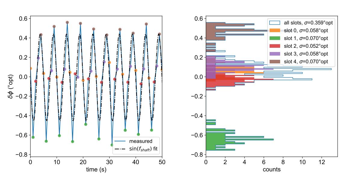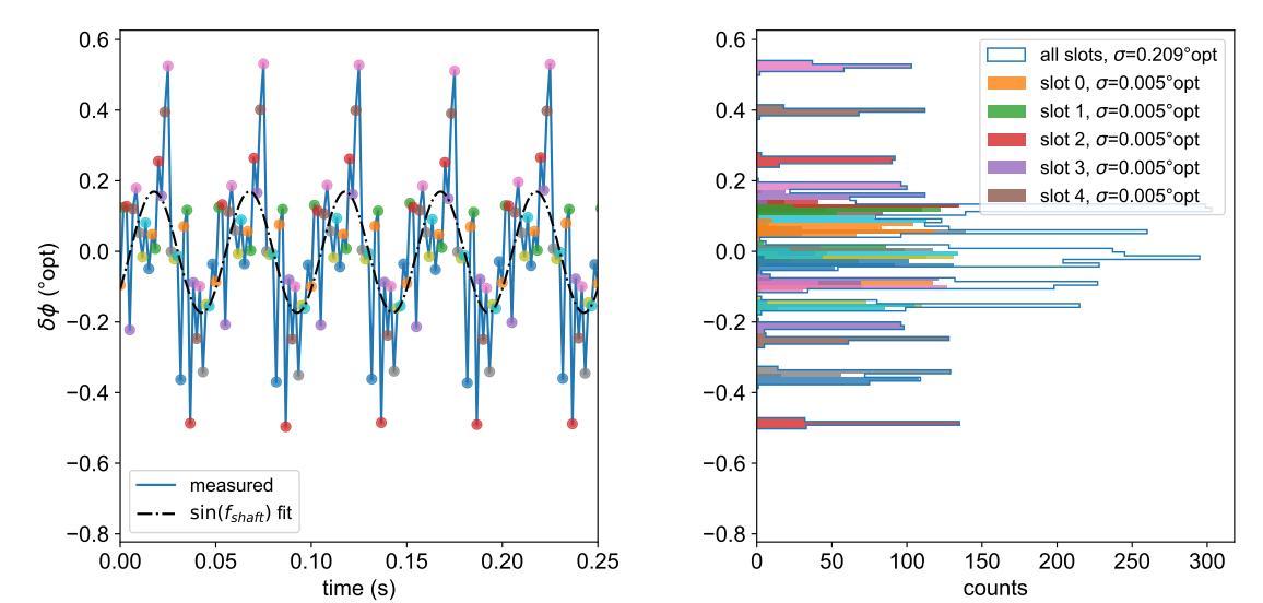 對于 n 槽葉片,每第 n 個周期測量都是對同一槽的重復測量。因此,我們為與該葉片的 5 個槽相對應的周期測量值分配不同的顏色。以槽 1 為例(綠色)。它的平均周期誤差約為−0.65°opt。這意味著標記槽位 1 周期結束的邊緣比預期早 0.65°opt。非確定性抖動將綠色分布的寬度設置為僅為 0.070°opt,因此相位誤差從一轉到另一轉的再現性非常好,并且由確定性誤差主導。簡單地說,對于單個槽位,相位誤差的確定性源確定平均值,而非確定性源確定抖動(標準偏差)。