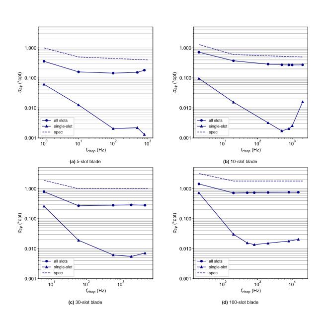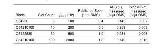 表1中列出了實測性能和已發布規格的表格比較。為簡單起見,為每個葉片選擇單個斬波頻率。顯示了“所有槽”和“單槽”抖動值,但由于“所有槽”測量與大多數斬波實驗相關,因此應將該值與已發布的規格進行比較。