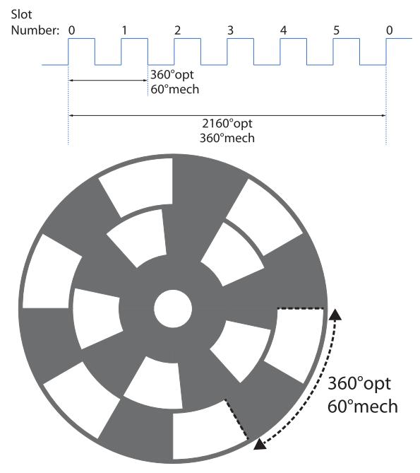具有 n 個槽的光學斬波輪每機械旋轉 360°,將前進 n×360°opt(光學角度)。我們將這些單位指定為光學度數 (°opt) 和機械度數 (°mech)。圖 2 顯示了 6 槽葉片的區別。