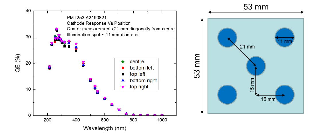 2.1 光陰極光陰極面積為28.1cm2,較之通常的像管尺,18毫米、25毫米或40毫米直徑大得多。我們使用了Photek生產的光度計來評估光陰極響應的均勻性。該光度計使用寬帶紫外/可見/紅外光源和窄帶濾光片,光斑直徑為11mm。如圖1所示,分別測試5個不同的位置,然后進行對比測試。
