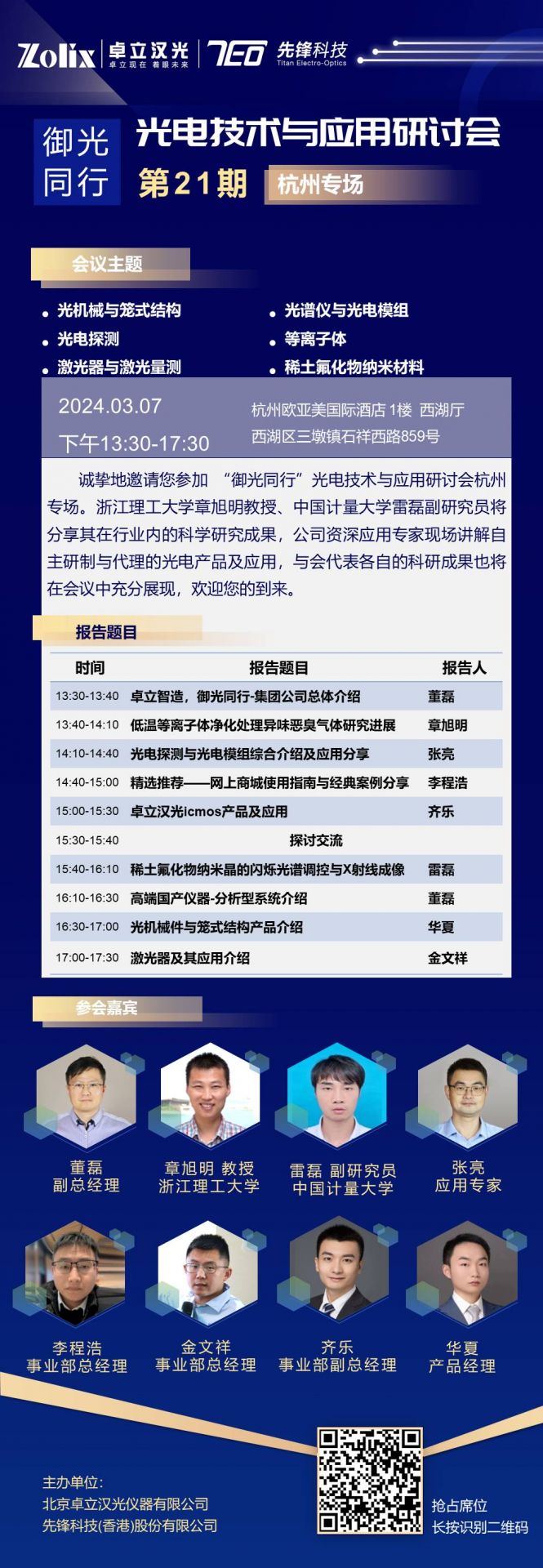 由先鋒科技與卓立漢光聯(lián)合舉辦的第21期“御光同行”光電技術(shù)與應(yīng)用研討會(huì)杭州專場(chǎng)將于2024年3月7日下午13:30-17:30在杭州召開。