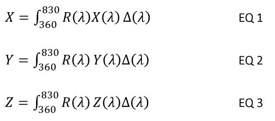 CIE推薦用以下公式來確定任何給定顏色的紅色(X),綠色(Y)和藍色(Z)的三刺激值: