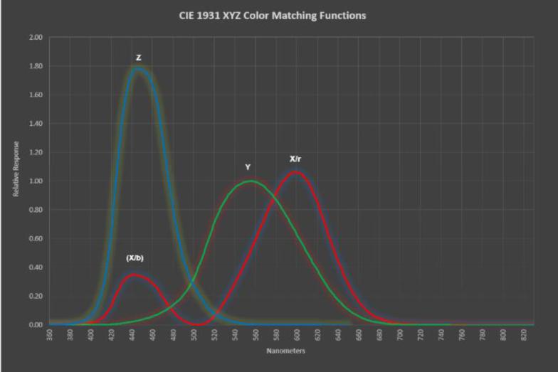 紅(兩片X/red和X /blue),綠(Y) 藍(Z)濾光片和探測器用于CIE 顏色匹配函數,和人眼錐細胞的彩色視覺系統是相匹配的。這些功能也被CIE標準觀察者所驗證。