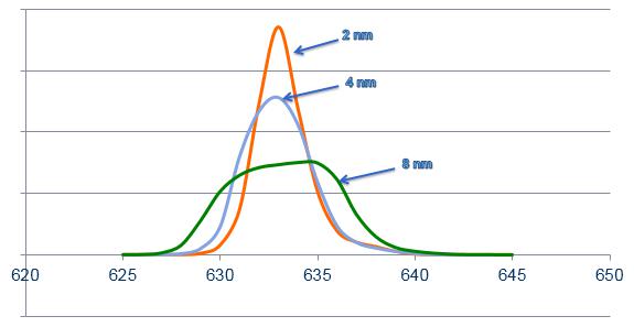 Photo Research公司已經提供了30多年的光譜解決方案,并且是第一個引入自掃描多元素檢測系統的公司。我們的優質系統,PR-7系列,具有穩定的熱電冷卻探測器,多達八個測量孔徑和自動同步功能,確保無論顯示器的頻率特性如何都可以保持精度。PR-740是靈敏度更高的,令人難以置信的閾值靈敏度為0.000015 cd / m2 ,可以測量一個被命令為0,0,0的OLED顯示屏!我們的PR-7系列的*新成員,PR-788具有500,000,000:1的令人難以置信的動態范圍,使其成為任何商用顯示產品的光譜對比度測試的解決方案。PR-6系列具有電池供電,便攜性,占地面積小和手持操作等特點。PR-680具有雙檢測器 --二極管陣列和光電倍增管(PMT),可以使用同一臺儀器進行高精度的基于光譜的光譜和時間(上升時間,閃爍)測量。所有PR-7系列解決方案都具有自動改變帶寬的功能。分光輻射計的帶寬由出口狹縫的尺寸和衍射元件(光柵)的分辨率控制,光譜帶寬在峰值的全寬半高(FWHM)處測量.圖6是使用具有可變帶寬特征的HeNe激光器(632.8nm)的PR-740的測量結果。注意,盡管4nm和8nm測量的峰較低,但每條曲線下的面積相等。