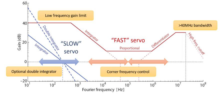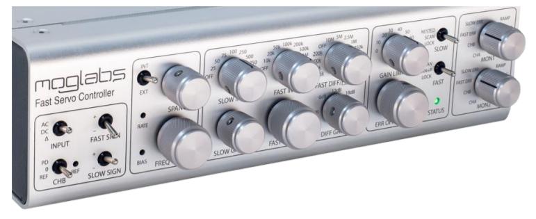 FSC是一臺超快速PID伺服驅動器,用于高帶寬激光器鎖定控制,包括分離的快速(電流)于慢速(壓電)反饋控制回路,可完整控制激光器頻率。控制回路可為鎖腔、激光線寬壓縮、拍頻偏移鎖定等應用優化調節。