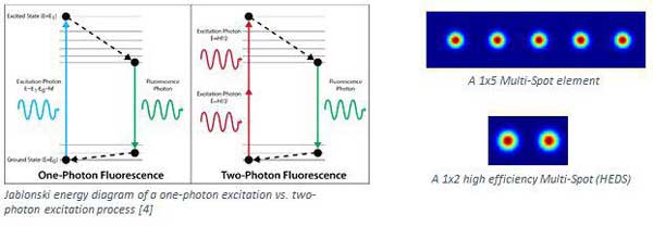 圖6.2 雙光子熒光原理示意(左);多焦點(diǎn)結(jié)構(gòu)(右)