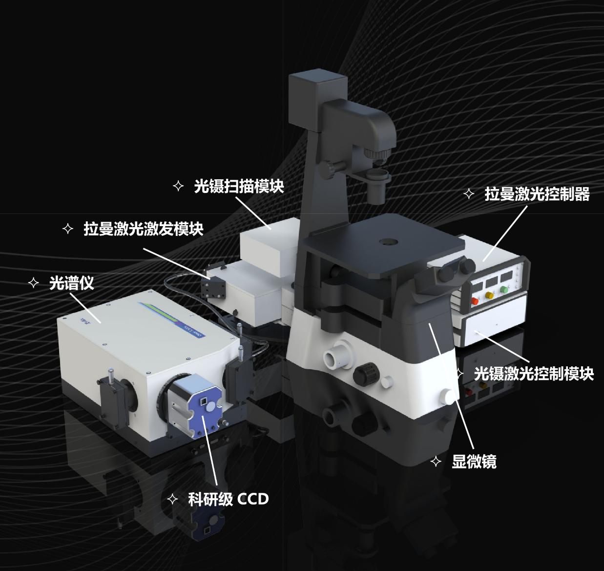 結(jié)構(gòu)二:在卓立漢光自主研制的標(biāo)準(zhǔn)RTS 顯微共聚焦拉曼光譜儀的基礎(chǔ)上配置具有雙層無限遠(yuǎn)光路的倒置顯微鏡,上層光路多光阱光鑷系統(tǒng),拉曼激光從顯微鏡的側(cè)口進(jìn)入,拉曼信號(hào)原路返回接光譜儀,可內(nèi)置不同波長(zhǎng)激光器,也可外部耦合激光器,拉曼信號(hào)通過光纖或者空間光路耦合到光譜儀,光路如下:
