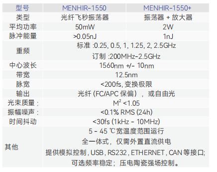 無論是實(shí)驗(yàn)室自搭,建還是高科技公司商品化的基于鎖模飛秒激光器的光頻梳,其飛秒激光器部分都是整個(gè)光梳系統(tǒng)內(nèi)硬件成本占比最高的部分。其中瑞士Menhir公司的GHz重復(fù)頻率的光纖飛秒激光器在搭建GHz大梳齒間隔的光頻梳應(yīng)用上為廣大科研以及OEM用戶所接受與推崇。其常用產(chǎn)品分為250MHz,1GHz,2.5GHz三種重復(fù)頻率的型號,波長在1545-1565nm,脈沖寬度250fs; 重復(fù)頻率越高價(jià)格越高。