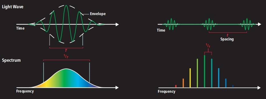在圖3.中,左邊是一個(gè)單獨(dú)的飛秒脈沖,把時(shí)間域的飛秒脈沖從頻率域(也就是光譜域)來觀察的話,就是一個(gè)有一定帶寬的光譜,脈沖寬度越短則光譜帶寬越寬。而如果能夠做到一系列飛秒脈沖的載波包絡(luò)偏移頻率fceo,以及這一系列飛秒脈沖的重復(fù)頻率ffeq 保持穩(wěn)定的話,則這一系列飛秒脈沖串在頻率域觀察的話,就可以形成不僅僅初始頻率穩(wěn)定,而且其頻率間隔也穩(wěn)定且美妙的光頻梳結(jié)構(gòu)。在這里面就要強(qiáng)調(diào)了,考察光頻梳優(yōu)劣最主要的是,要求光頻梳“穩(wěn)和強(qiáng)”而并非是梳齒結(jié)構(gòu)的“細(xì)”。為什么呢?