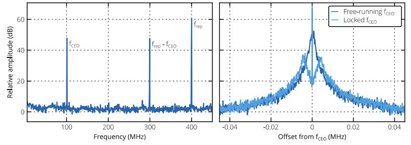 圖2. 基于Menhir-1550的400MHz光纖飛秒激光器實(shí)現(xiàn)fceo鎖定