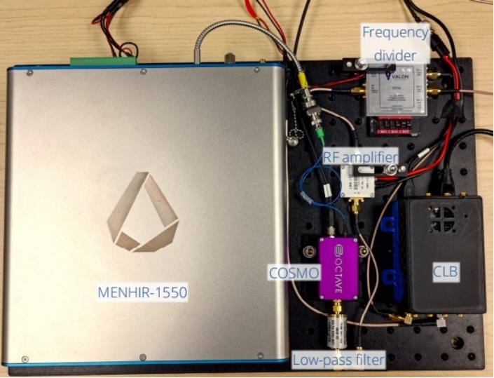 以圖1為例,可見整套光頻梳系統(tǒng)可以布置在一個(gè)小于300*450mm尺寸的面包板上,包含一臺(tái)1555nm波長(zhǎng),>80mW平均功率輸出,200fs脈沖寬度,400MHz高重復(fù)頻率的Menhir-1550光纖飛秒激光器,其單發(fā)脈沖能量200pJ正好匹配美國(guó)Octave公司COSMO (Comb-Offset Stabilization Module)模組,COSMO 是一個(gè)即插即用型的一體式fceo檢測(cè)模塊;其輸出的幾百M(fèi)Hz帶寬的fceo信號(hào)經(jīng)過射頻信號(hào)低通濾波器,射頻信號(hào)放大器和射頻信號(hào)分頻器處理為60MHz帶寬后,接駁加拿大Waxwing公司的CLB( Comb Lock Box), 即可自動(dòng)給出反饋信號(hào)施加到Menhir-1550鎖模飛秒光纖激光器上實(shí)現(xiàn)閉環(huán)反饋。