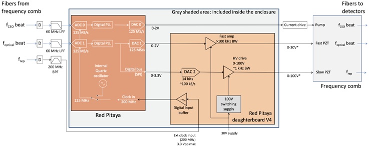 CLB光梳鎖定盒包含接收,反饋與控制的電子學(xué)硬件和計(jì)算機(jī)軟件。請(qǐng)參考以下的示意圖: