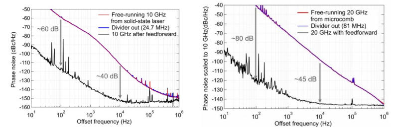 圖六.左:基于Menhir-10GHz飛秒激光方案的噪聲譜;右:基于微腔光梳方案的噪聲譜