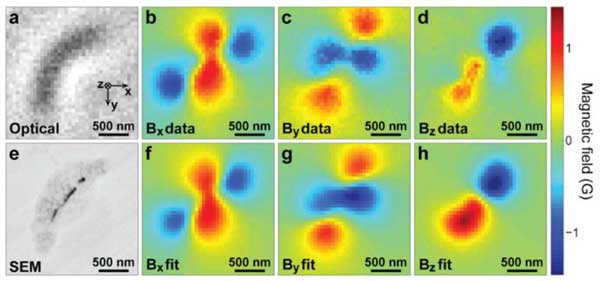 圖5。(a)趨磁細菌的光學圖像。(e)同一細菌的SEM圖像,其中磁性納米粒子(黑色)清晰可見。(b,c,d)磁場x, y, z分量由NV金剛石光學探測磁共振測量確定。(f,g,h)實測場分布的數值擬合(來自[g])。