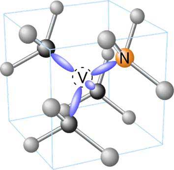 圖2:金剛石中NV色心由碳原子(灰色)、氮原子(橙色)和相鄰空位組成,并有懸空鍵(紫色)[1]。