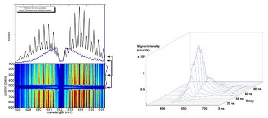 通常來講,等離子環境具有高動態和瞬時的特性,所以成像及光譜信息要在數十納秒(甚至皮秒量級)的時間內進行捕獲。此時普通探測器無法提供這么高的時間分辨率,像增強型探測器(ICCD/ICMOS)是較為合適的探測器,它的像增強器光陰極門控能提供納秒量級的時間閘門。特定波長的帶通可以篩選出特定化學結構(分子,原子團,原子,離子等)的特征光譜,濾光片只需要在ICCD相機前安裝好,就可以用于2D PLIF或者LIF圖像的采集。