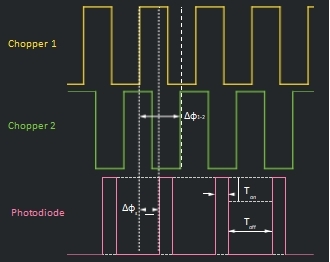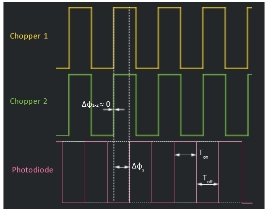 圖 5: 模擬光束通過兩個斬波器的示波器示意圖。(a)在相位對齊之前,斬波器1和斬波器2的信號之間存在相位差?φ1−2 ,光電探測器信號占空比(Ton /Toff )很可能為小于50%。(b)在相位對齊之后,光電探測器輸出波形有50%的占空比。光探測器信號的相位差?φs仍然存在。