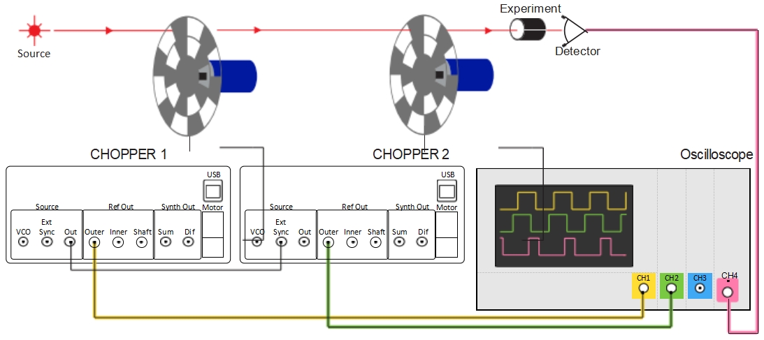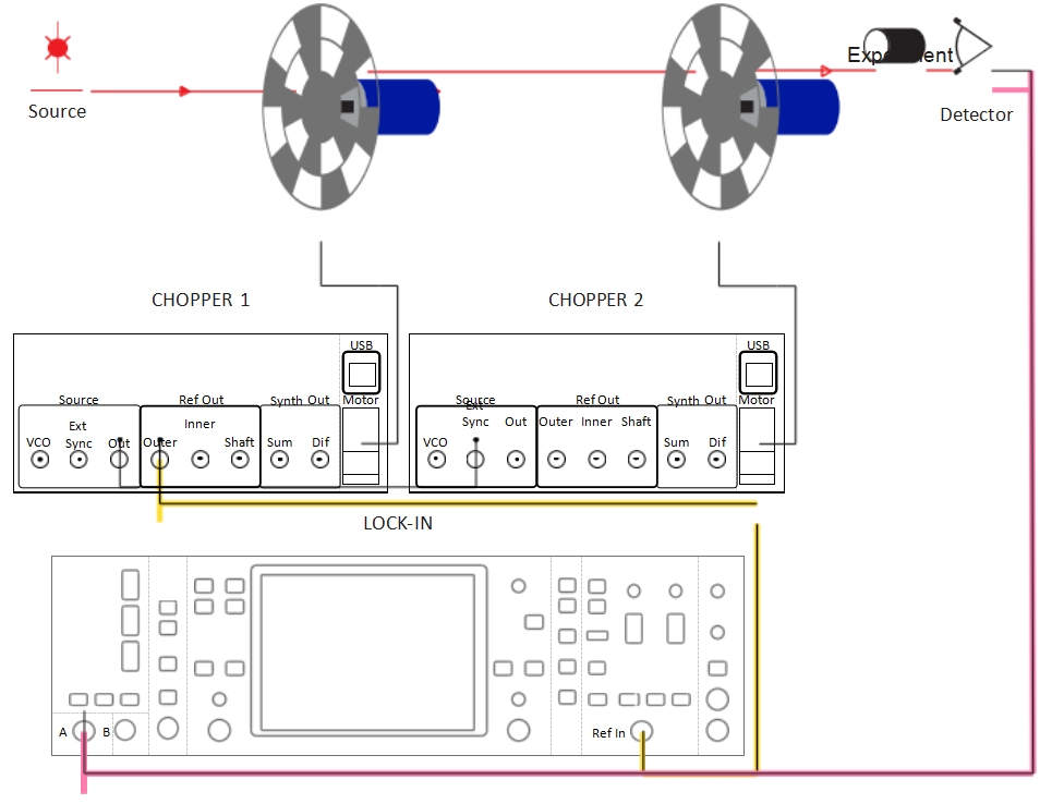 - 同步兩個光學斬波器,并調(diào)整其中一個葉片相對于另一個葉片的相位。