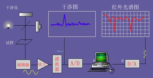 工作原理:光源發出的紅外輻射,經干涉儀轉變成干涉圖,通過試樣后得到含試樣信息的干涉圖,由電子計算機采集,并經過快速傅立葉變換,得到吸收強度或透光度隨頻率或波數變化的紅外光譜圖。干涉圖從數學觀點講,就是傅立葉變換,計算機的任務是進行傅立葉逆變換。