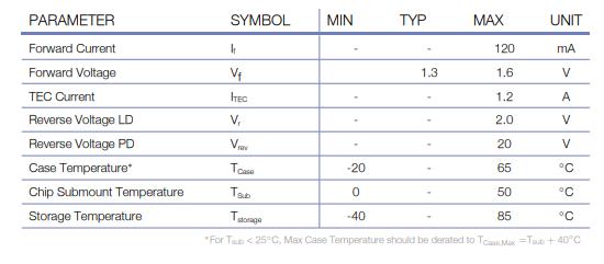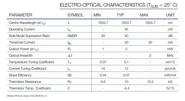 如下列表是中心波長為1653.7nm的DM激光器的主要參數。