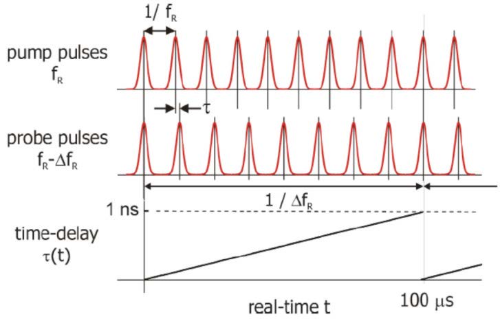 異步光學采樣(Asynchronous Optical Sampling, ASOPS)系統采用相互鎖定、有固定重頻差的兩臺激光器來實現變延時的泵浦- 探測。主激光器(激發光)以fR 重頻輸出,而從激光器以略低頻率(fR-ΔfR)輸出;如果初始時刻兩臺激光器同時輸出,則相互之間的延時會以1/(fR-ΔfR)-1/fR ΔfR/fR2,且經過1/ΔfR 時間之后兩臺激光器的脈沖再次對準。例如,如果主激光器振蕩頻率為1GHz,從激光器振蕩頻率為999,999,000Hz(fR=1GHz, ΔfR=1kHz),則延時的步距為1,000Hz/(1,000,000,000Hz)2 = 10-15s = 1fs,最長延時(泵浦- 探測時間窗口)為1/1,000Hz = 1ms。