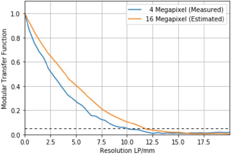 通過評估不同位置的平均對比度,x,y方向的對比度可以分辨出區(qū)別如圖4所示。值得注意的是,雖然平均對比度在X方向上有1.1%的微小變化,在Y方向上有3.7%的變化。在計算的MTF曲線中也觀察到這種XY依賴關(guān)系,如圖7所示。這可能是由幾個因素造成的,需要進一步研究。最終計算出的MTF曲線(圖8)是通過取中心處的X和Y MTF曲線的平均值來計算的。