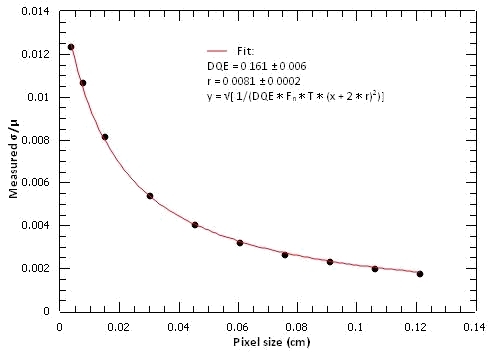 Figure 9: Fit to standard deviation as a function of pixel size using Equation 4, parameterized with QEeff and r.