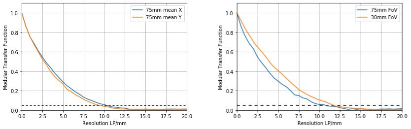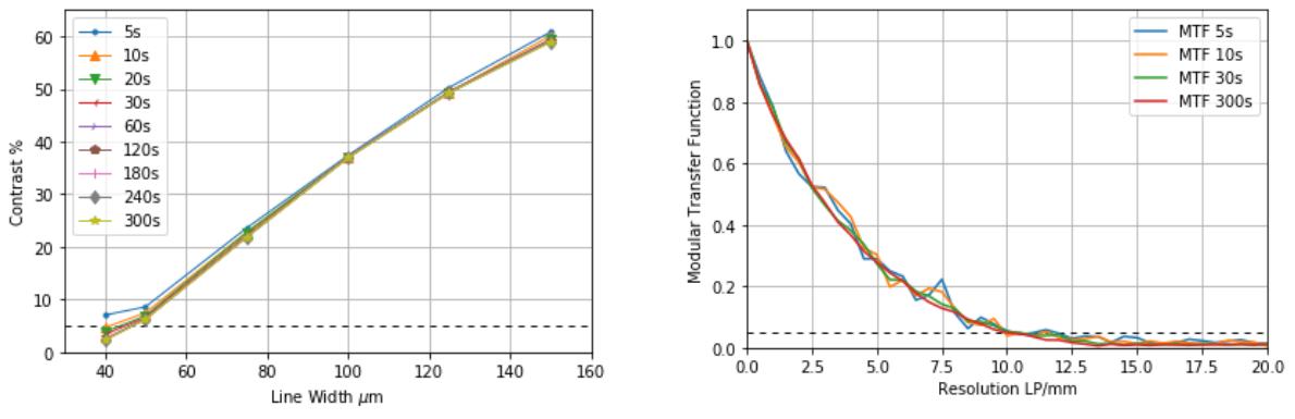 Figure 5: 不同尺寸線寬 、不同積分時間75mm視場下對比度 Figure 6: 75mm不同分辨率條件下75mm視場 MTF曲線(5、10、30、300s曝光時間)