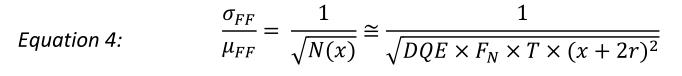 在實際過程中,由于探測器的非均勻性、光收集效率、每一次內(nèi)部中子沉積引起電子不確定性以及閃爍體內(nèi)部光產(chǎn)額,所以DQE(探測器量子效率)明顯小于QE(理論效率)。其中中子作用閃爍體的能量沉積就可以在接近0keV(這個能量有大概率從閃爍體表面產(chǎn)生和逃逸)到大于100keV(在閃爍體內(nèi)移動)。此部分,我們嘗試通過分析暴露在全白光束的信號來估算量子效率DQE,同時也考慮到系統(tǒng)內(nèi)部的光路系統(tǒng)會引起相鄰像素之間重復(fù)計算。對于一個均勻的中子通量源,每個像素點的平均強度標記為ηFF,每個像素點的平均偏差σFF ,在一定區(qū)域的探測器中對捕獲的中子產(chǎn)生的內(nèi)轉(zhuǎn)換電強度進行泊松分布函數(shù)表征如下方程: