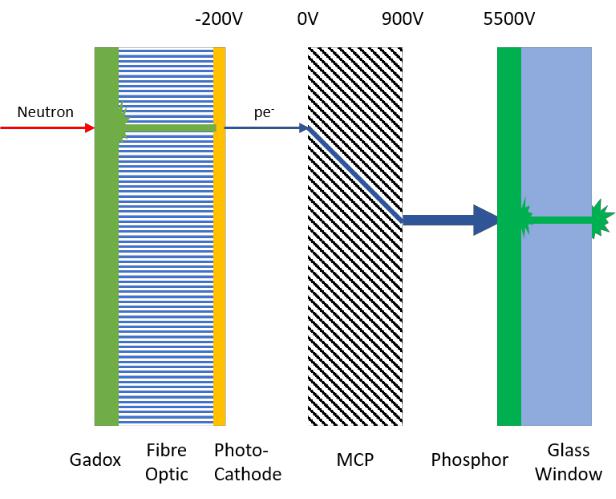 探測器部分N-Cam探測器部分包含一個厚度為20 µm、密度為7.3mg/cm2的Gadox閃爍體同時具有75mm靶面的有效探測區(qū)域。一個厚度為1mm的發(fā)黑鋁材料(防止低能量X射線干擾,類似X射線相機防止可見光的鈹窗)被放置在Gadox閃爍體前端2.7mm處,這樣就使待測對象與Gadox閃爍體之間的最小距離為3.7 mm。Gadox閃爍體直接應(yīng)用于Photek 的MCP175像增強器的光纖輸入窗口前端。光纖輸入的數(shù)值孔徑(NA)為1.0,保證了閃爍體光的高收集效率。典型的中子和閃爍體材料互相作用會產(chǎn)生30kev的內(nèi)部電子沉積【8,9,10】,從而在閃爍體的平均電子路徑上會形成1200個光子的計數(shù)。大約32%的光信號會通過光纖窗口傳輸?shù)焦怆婈帢O。在此次實驗中閃爍體由于沒有反射覆蓋層以最大化優(yōu)化空間分辨率,造成了一部分的光損失。同時在光纖窗口的內(nèi)表面沉積的S20光陰極在閃爍體545nm發(fā)射峰位置提供了10%的量子效率。通過上述的計算得出,每吸收一個中子,在像增強器端會產(chǎn)生38個光電子;這些產(chǎn)生的光電子會在光陰極和微通道板之間的300um空間,通過一個200v的電壓加速。微通道板MCP是一個有數(shù)百萬個孔的薄玻璃板,可以用來放大電子信號【11】。N-Cam中子相機系統(tǒng)配置有一級MCP,該MCP具有直徑為12um間距為15um的陣列孔,孔徑比L:D是60:1。MCP的增益是由電壓控制的,對于大多數(shù)測試設(shè)置為+900v。通過MCP放大后的光電子通過5.5kv的加速電場轟擊P46熒光屏并輸出成像。在上述的電壓增益過程中,增強器的總光增益可達104。