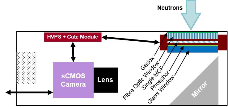 N-Cam使用20μm 厚的Gadox閃爍體直接應(yīng)用于75mm Photek像增強器前端(如右下圖所示)。像增強器中單層微通道板后端使用具有快速衰減時間的P46熒光屏,使閃爍體的光信號可放大104倍,而后聚焦成像在具有2048 x 2048像素,等效像素38μm的制冷型sCMOS相機上。與傳統(tǒng)中子相機比較,N-Cam可以在不犧牲空間分辨率的情況下通過像增強器顯著提高靈敏度。通過理論估算和實驗分析,N-Cam在中子通量為2×107n/cm2/s情況下依然可以達到很好的信噪比。同時由于N-Cam的高靈敏度因此在低通量中子實驗中仍然可以進行成像分析。
