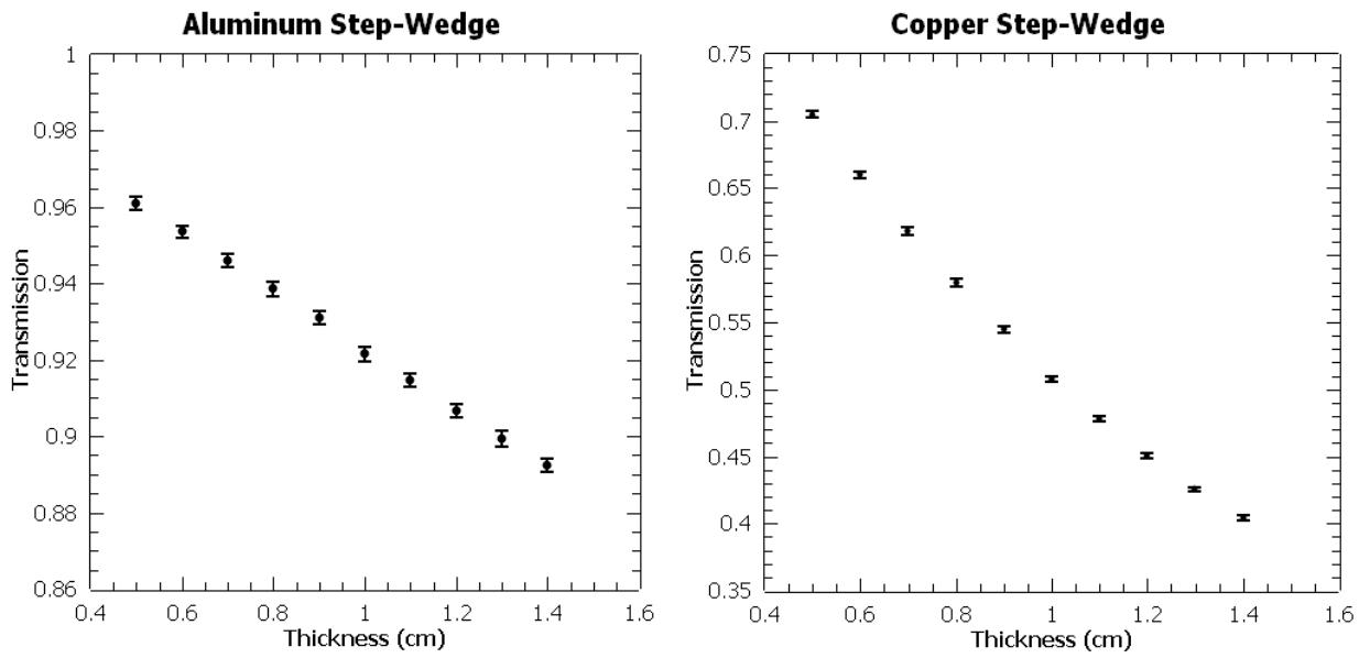 Figure 11a. Transmission through the aluminum step-wedge with error bars representing 1 σ noise.
