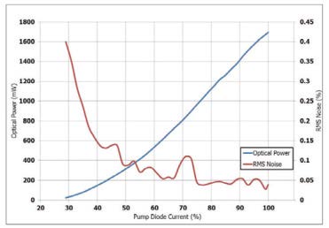 左圖, Ventus 532 藍線為輸出功率, 紅線為RMS 噪聲隨二極體泵浦源驅動電流的變化圖