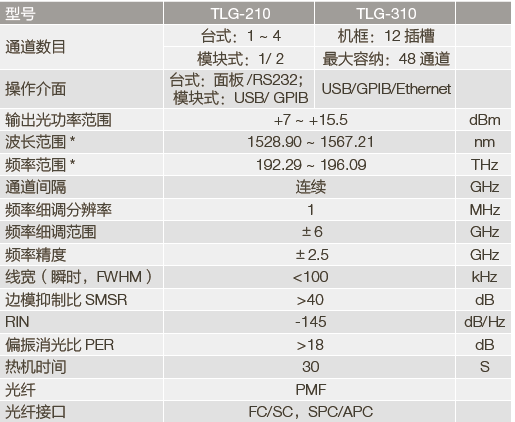 TLG-210 為日本Alnair Labs 公司提供的臺式可調(diào)諧窄線寬光源,最多可支持4 個(gè)通道輸出;TLG-310 為插槽式多通道光源,適合自動化測試產(chǎn)線使用