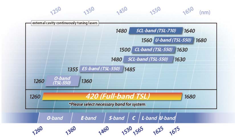 Santec TSL 分為5 系列和7 系列。其中5 系列分為A、C 兩個(gè)級(jí)別,又按照波段范圍分為O(1260~1350nm)、ES(1355~1485nm)、CL(1500~1630nm)、SCL(1480~1630nm)、LU(1560~1680nm)多個(gè)型號(hào);7 系列性能更高,主要針對(duì)CL、SCL 波段。