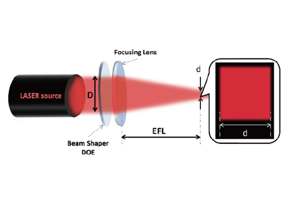 衍射光學(xué)元件(Diffractive Optical Elements,DOE)是新型的微納光學(xué)器件,通常是在光學(xué)基底的表面通過(guò)光刻工藝制造的二維陣列排列或訂制規(guī)律排列的、微米尺度的衍射單元。激光經(jīng)過(guò)衍射光學(xué)元件后其波前位相被精密調(diào)控,從而實(shí)現(xiàn)在一定位置(通常是焦點(diǎn))的特定強(qiáng)度分布、位相分布,并可實(shí)現(xiàn)縱向傳播特性調(diào)控。