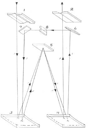 Douple Pass 光路結構:1. 入射狹縫;2. 出射狹縫; 3. 準直反射鏡; 4. 聚焦反射鏡; 5. 光柵; 6. Double Pass反射鏡; 7. Double Pass 反射鏡; 8.中央孔徑狹縫