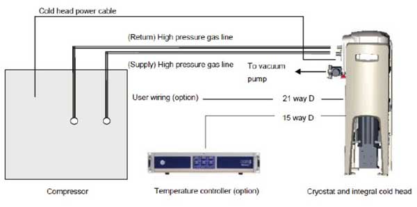 主要工作原理:Optistat Dry 干式制冷機采用GM 制冷機,主要部件有冷頭、壓縮機以及高壓氦氣管。這三個部件組成了一個閉合的氦氣循環回路,可以產生制冷功率。冷頭是GM 制冷機循環的場所,通過兩根高壓氦氣管以及供電引線連接到壓縮機。其中一根高壓氦氣管供給高壓氦氣,另一根回收膨脹后的低壓氦氣。壓縮機提供必需的高壓氦氣流量來提供足夠的制冷功率。