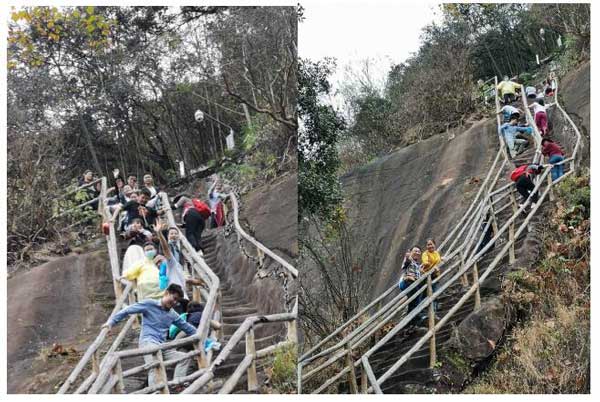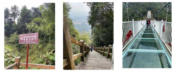 第一天的興奮還未散去,就開始了我們第二天的挑戰之旅。這一天我們挑戰了1638級的祥云梯,來到祥云梯腳下,只見告示牌上寫著“量力而行”四個字,極目望去,高不見頂,內心一陣掙扎,山不在于高,而因為陡,我們彼此相望,互相打氣,踏上這幾乎80°的階梯,然而挑戰并沒有結束,等待我們的還有一條全透明高空景觀玻璃橋,該橋全長316米,橋面通體透明,可以非常清楚地看到谷底的景色,如果在谷底仰望,玻璃上的人影也清晰可見。最終,一個都沒有少,我們登上了祥云梯,也走向更加驚險刺激的玻璃橋。
