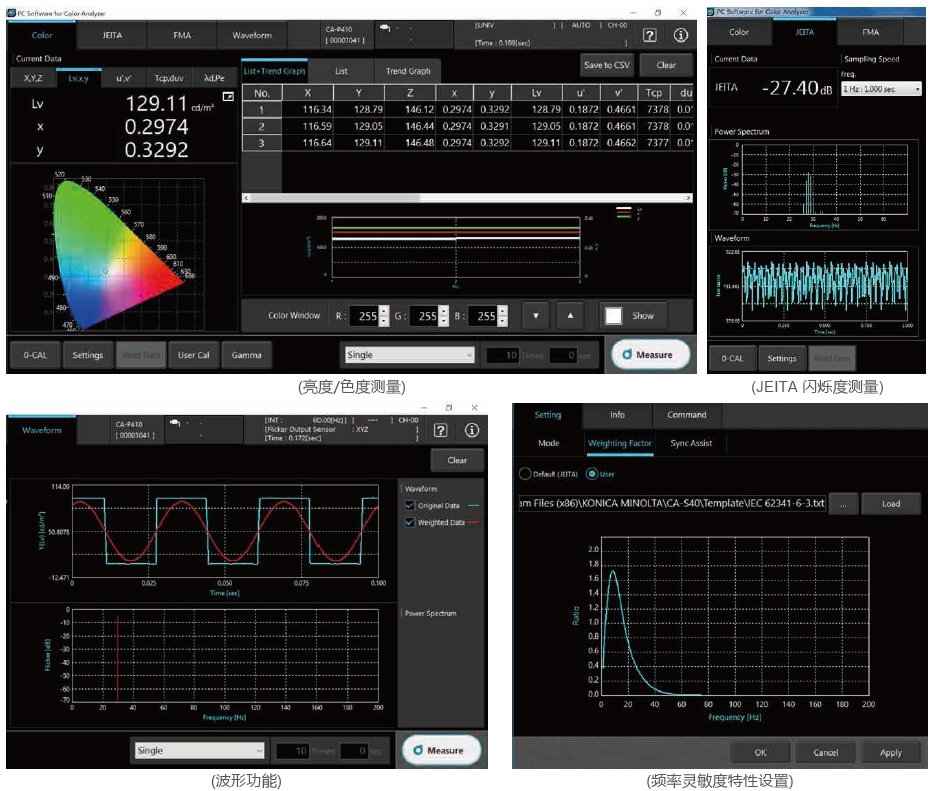 CA-VP410A 和 CA-VP427A 的軟件需從官網進行下載CA-S40測量軟件與軟件開發套件使得探頭可以直接連接計算機進行測量,且支持 Windows10 和 Mac 操作系統。除了執行亮度、色度和閃爍度測量并保存結果等基本操作之外,還可以通過波形函數記錄發射波動的實時數據。此外,該應用程序還整合了其他可供用戶在各種測量操作中有效使用的功能,包括自動檢測顯示器的發射頻率并用于內部同步。