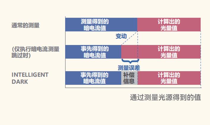 通過每次測量時都對光源和暗電流進行測量,并計算測量值差異來消除暗電流波動影響,分光亮度計可以實現更高精度。暗電流測量有時會被跳過以節約測量時間,但暗電流值可能會隨著時間流逝等變化進行波動。此時,波動量會疊加在此前計算出的光線強度上,導致測量精度下降。INTELLIGENT DARK功能可以在跳過暗電流測量的同時,使用來自傳感器的補償信息來補償波動量,從而在維持高精度的同時縮短測量時間。