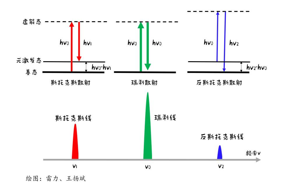在光與物質相互作用過程中,拉曼散射光與入射光的頻率差(拉曼頻移)反映物質的固有屬性,可以根據拉曼頻移的大小來研究物質的結構與物性。值得注意的是,拉曼散射現象和熒光現象物理的機制不同,拉曼效應不能用實際電子能級躍遷來解釋,而用元激發的虛能級躍遷來說明。拉曼散射過程中,如果散射光子的能量小于入射光子的能量(hv1<hv0),稱之為斯托克斯散射;如果散射光子的能量大于入射光子的能量(hv1>hv0),稱之為反斯托克斯散射。在一次常規的拉曼散射物理過程中,正、反斯托克斯散射會同時發生,由于基態和激發態的相對熱占比遵循玻爾茲曼分布,室溫條件下正斯托克斯譜線的強度要高于反斯托克斯譜線的強度(Is>Ias),在實驗上可以通過測量正、反斯托克斯散射譜線強度比來推測物質的溫度。