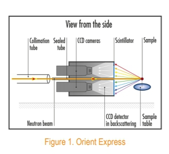 早期搭建的經(jīng)典勞厄相機與PSEL合作完成,通過使用膠片和暗室顯影設(shè)備搭建的Orient-Express,主要應用于快速檢查晶體質(zhì)量和定向。它由兩個PSEL相機組成,觀察一個平面閃爍體。入射的白中子束通過相機后,在反向散射位置撞擊樣品。衍射圖樣從相機機中讀出,完成拼接,顯示在電腦屏幕上。曝光時間一般在幾秒鐘到幾分鐘之間,大約在5年前,這套系統(tǒng)升級為CCD探測器,具備更高的通訊速度。